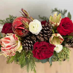 Enjoy the sights and scents of the season with this fun filled holiday bouquet. We pair roses, ranunculus, amaryllis and evergreens with pine cones and baubles sure to brighten anyone's holiday table. This bouquet measures 16" X 8" X 8" and is perfect on a dining table or island.