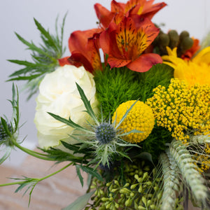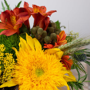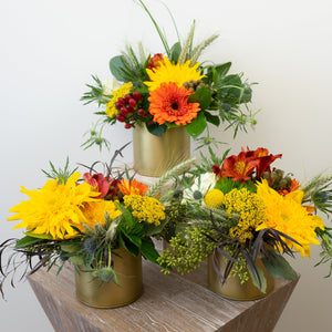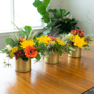 What's better than one than one fall arrangement????? Three!!!! Our Fall Trio effortlessly fills your home with all the fall feels and warmth of the season. Soft gold metal cylinders are brimming with sunflowers, gerbera daisies, wheat, fall foliage with other cool textural fall blooms. Together they line your Thanksgiving table without blocking anyone's view, scatter around the home to add ambiance to each room, or take as hostess gifts to all the fall dinners you attend.