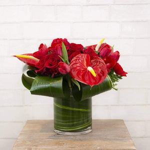 Red antheriums, roses, tulips, and anemone in clear glass vase with leaf wrap.