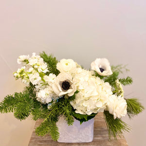 Jump into the snowy winter season with our Winter White Bouquet. Hydrangea, ranunculus, anemone, queen ann's lace, and stock are accented with evergreens designed in a matte modern white container. The stylish vase is 6" X 6" and the finished bouquet is 12" X 12". It's a perfect size for an island or dining table.