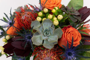 Unique and long lasting flowers and foliage join forces to satisfy all of your gift giving needs. Rich colors and lots of texture are the main ingredients of a stylish bouquet fit to top any table. Keep the gift on giving with succulent blooms and soil to plant when the bouquet fades.