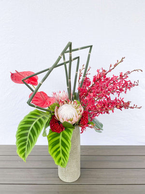 Clean, bold geometric lines created by vibrant flowers and slick foliage add interest to new homes, offices and hospitals. Our designer’s creativity will make your gift shine by using interesting greens and flowers to create a stunning piece of floral art. Likely to feature clean lined orchids, anthuriums, protea, this is a designer’s choice of the slickest and freshest most interesting blooms on hand. Framed with lush bold foliage. You can expect to see bright jewel tone colors such as lime greens, hot pinks, reds, yellows, purples and oranges. Flowers are designed in a geometric purposeful style where they can create a bold impact. Sending a gift of Modern Blooms will show your style and taste for design. This bouquet is a popular gift for a man or business client.